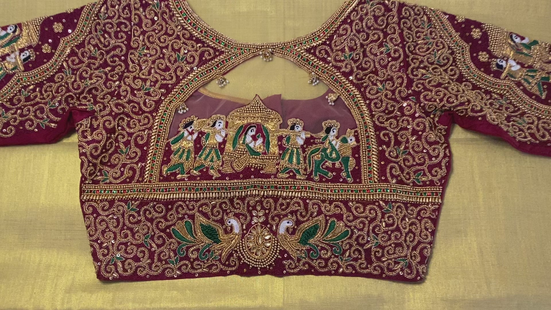 This Doli Bridal blouse is perfect for making a statement on your special day. It is perfect for pairing with your sarees /lehengas. Expertly crafted with Maggam|Aari work, this blouse adds a touch of traditional elegance to your Indian ensemble.