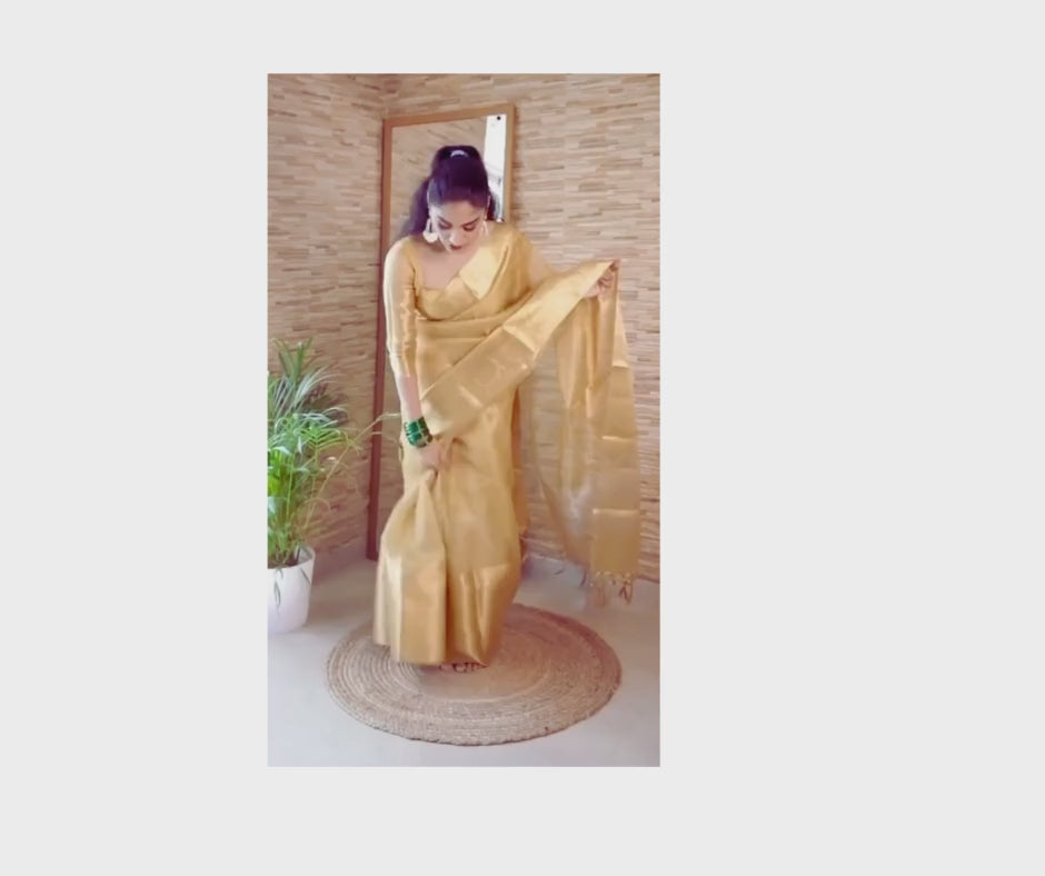Elevate your ethnic wardrobe with this exquisite Golden Tissue Silk Saree, a masterpiece that seamlessly blends traditional craftsmanship with timeless elegance. Crafted from premium tissue silk, this saree features a lustrous golden hue that catches light beautifully, making it an ideal choice for weddings, festivals, and special occasions. The delicate tissue fabric drapes gracefully while maintaining its structure, ensuring a flattering silhouette. The intricate weaving showcases authentic saree-making techniques, while the rich golden tone complements a wide range of skin tones. Perfect for those who appreciate refined, sophisticated ethnic wear that makes a lasting impression.